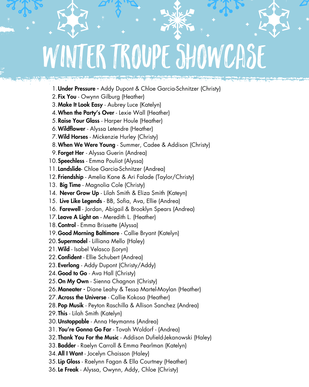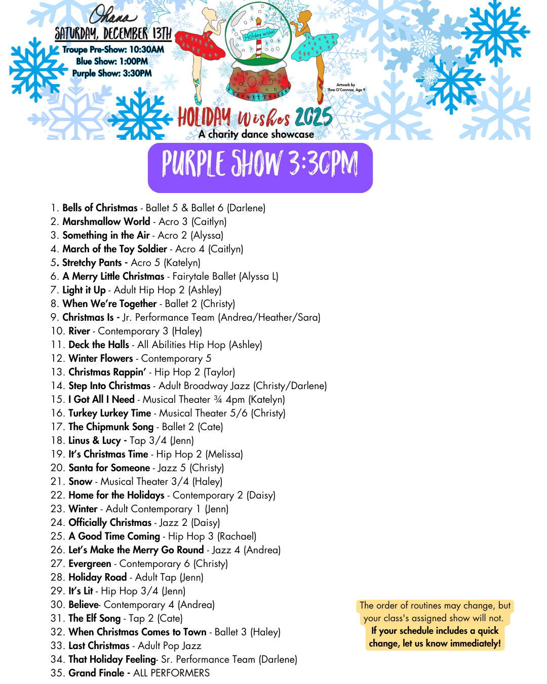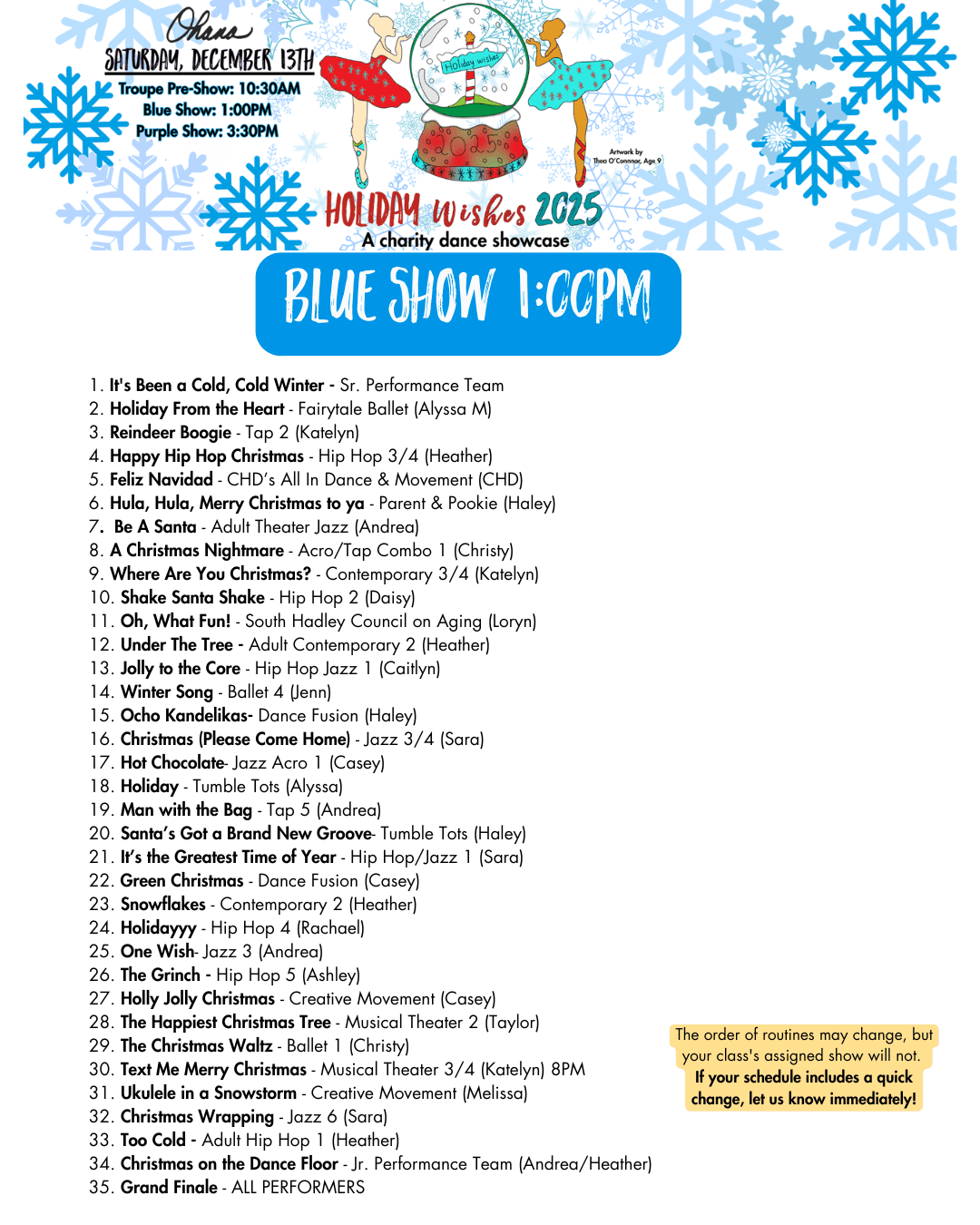 All classes will perform a holiday-inspired routine taught and choreographed by their instructor. Each class will only perform once: either in the 1pm show or the 3:30pm show.